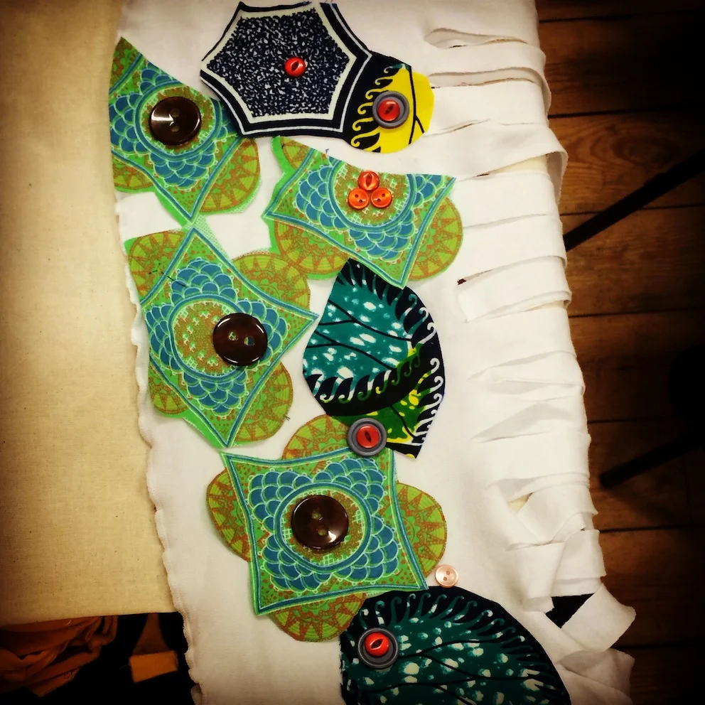 We teamed up with Brighton Museum to deliver a series of workshops inspired by exhibition Fashion Cities Africa for Dv8 Sussex Fashion students. We looked at African fabric prints and worked to create hand made prints to reflect each student. We also returned and gave them a crash course on head wrapping, leading to the students creating their own head wraps, embellished with a treasure trove of trimmings, beads and more!